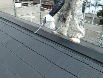 棟板金の釘で浮きがある箇所は打ち込んで、継ぎ部分にシールを打っていきます。