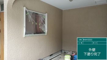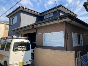 | ご提案内容 | 外壁の塗料は長く持つ無機ハイブリッドチタンガードで、既存の色とは全く違う色でイメージチェンジ。 既存と同じように2色で塗装。 外塀はプレミアムシリコンで塗装。 付帯部は下地処理後に塗装。 サッシ工事は南面1ヵ所アルミ戸袋、雨戸、建具2枚交換する。 ベランダはウレタン通気緩衝工法で施工。 |